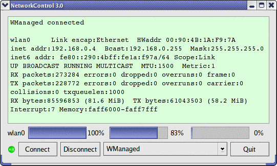 NetworkControl addresses a conspicuous lack in most Linux distributions — most tend to be short on easy-to-use network utilities, even something as trivial as a robust, informative way to log on and off a dialup connection. NetworkControl also provides the connection IP, configuration and statistics (gleaned from "ifconfig" and updated each second), and provides graphic signal levels for wireless interfaces, handy for evaluating a system of wireless devices.