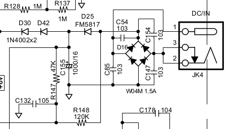 - Those familiar with electronics and schematic diagrams will see that the power jack, which is provocatively marked "DC/IN", is connected to a full-wave bridge rectifier (D16), followed by a 1000 µf 16V capacitor (C155).