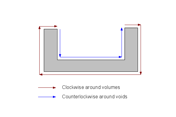 The computed volume is limited to the grayed area in the above graphic, and there is no limit to the number of volumes and voids that may be included in a complex profile. This means geometric profiles with multiple walls will be correctly analyzed. But because of this new capability, when writing tank profiles users must be sure that the profile's vectors rotate clockwise around volumes and counterclockwise around voids. Like this: