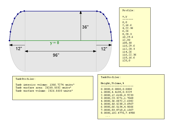 To use TankProfiler, a user creates a plain-text file containing a dimension profile of the tank to be analyzed. Such a file might contain these x,y coordinate pairs: