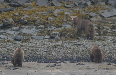 On nearby Kodiak Iskand, where hunting is allowed, there are fewer bears and much more food. As a result, the bears tend to be peaceful and not much trouble at all. While kayaking the west side of Kodiak Iskand I visited a family (of humans) who lived in a pretty, remote spot on the shore of an inlet. They allowed their small children to play outdoors without restriction. I asked the obvious question, "Aren't you worried about bears attacking your children"? "Not at all," they replied. As I paddled away in my kayak, within a mile of the children I encountered a bear eating sedge grass on the shore. He looked at me with complete passivity and resumed foraging. I thought to myself this was not at all like the bears on the Peninsula.