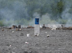 I arrived late on the day of the club meeting, so I only saw the end of the festivities. The club had pretty much run out of things to blow up (as well as ammunition to set off the explosions), but there were still a few things not in pieces. In the pictures on this page, you can see a couple of guys putting a 55-gallon drum on top of a refrigerator that had been a target earlier in the day. The drum holds what's left of the day's ration of explosives.