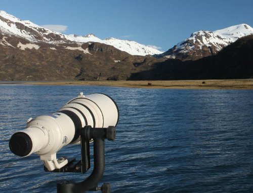 I have been doing this since 2002 with great success — my long lens means I don't have to stress the bears by getting too close, and it also means they don't get the chance to eat me as they did another photographer in 2003. Timothy Treadwell used to spend his summers a few miles away from where I visit, but he lived on shore, in a tent, surrounded by bears — until the fall of 2003, when he and his girfriend were eaten by a rogue bear.