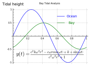 (7) $ \displaystyle y'(t) = \frac{c \omega^{2} r \sin\left(\omega t\right) + \omega \cos\left(\omega t\right)}{c^{2} \omega^{2} r^{2} + 1} $Equation (7) can be used to easily compute the times of slack water in the modeled bay and channel — its zeros are the slacks in the system, the times of no channel current (Figure 6, vertical lines).