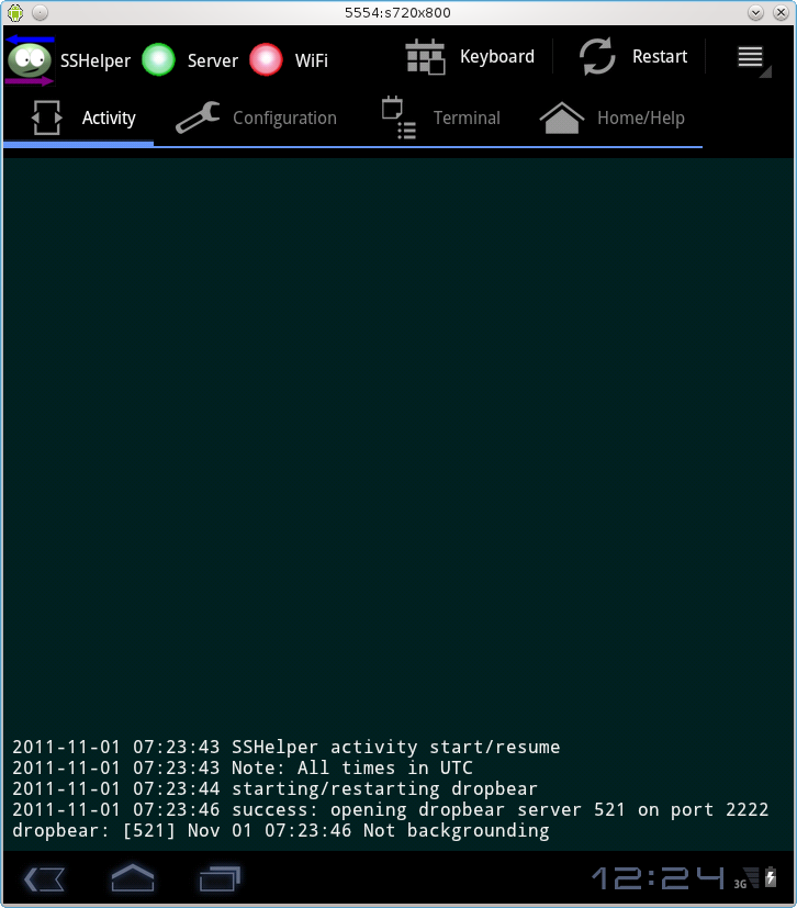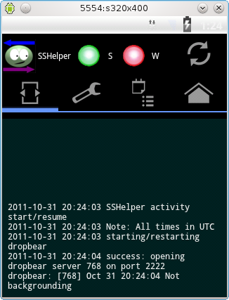 These LEDs show that the Secure Shell server started successfully and there is an active wireless connection. Contrast this with the session shown in Figure 1 at the top of the page, where no wireless connection is available (because it's not a real device, it's an Android development emulator).Server