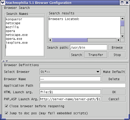 If all these features fail to locate your browser, you can simply type in a browser name and a path to its executable in the lower part of the browser dialog, then press "OK".