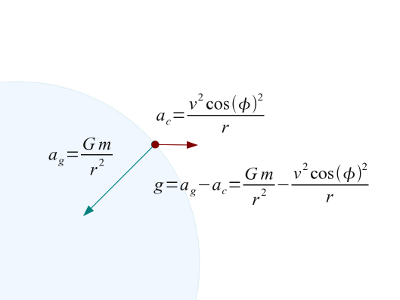 (4) $\displaystyle g = \frac{Gm}{r^2} - \frac{(v\ cos(\phi))^2}{r\ cos(\phi)} cos(\phi) = \frac{Gm}{r^2} - \frac{v^2 cos(\phi)^2}{r}$Where, in addition to terms already introduced: