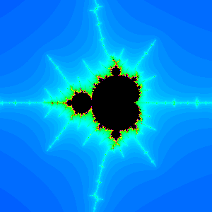 In the simplest Mandelbrot generators, each coordinate in the space is tested for membership in the set based on the iteration shown in (1) not diverging toward infinity. Those coordinates belonging to the set are given a distinctive color and the canonical Mandelbrot set shape appears (background of this paragraph). The more elaborate Mandelbrot set generators (like the one on this page) assign different colors to the points on the periphery of the set, based on how quickly they diverge toward infinity.