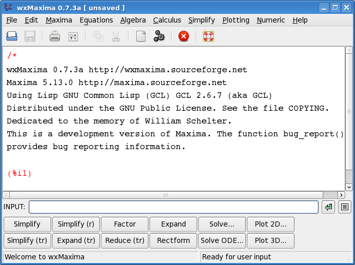 At this point, run wxMaxima. If you have finished your installation using the instructions above, you should be able to click a desktop icon, and the wxMaxima graphical interface should appear: