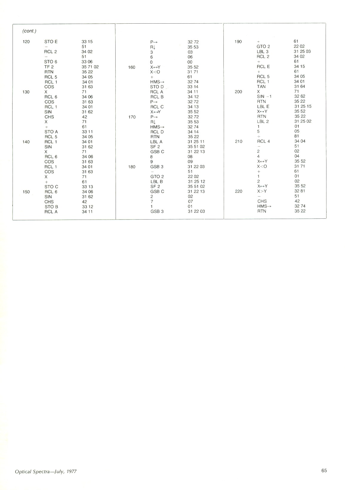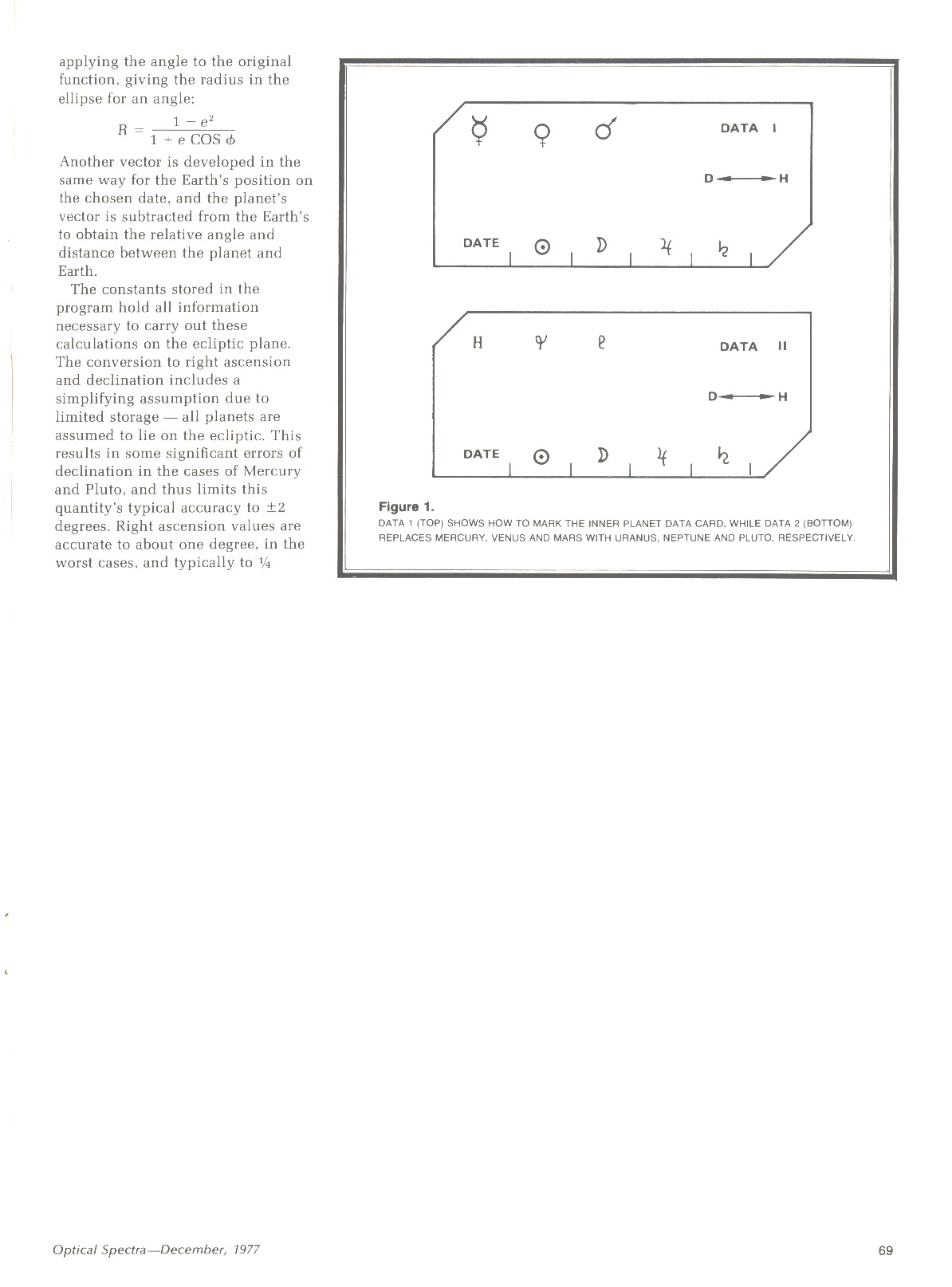 My next program was a bit more ambitious — a planetary ephemeris, a model of the solar system. This program actually required more than the HP-67 could provide (mostly because of tables of orbital data, not program steps), so users were obliged to model the solar system in sections — one magnetic card for the inner planets, one for the outer planets.This program was also published in Optical Spectra magazine in 1977: