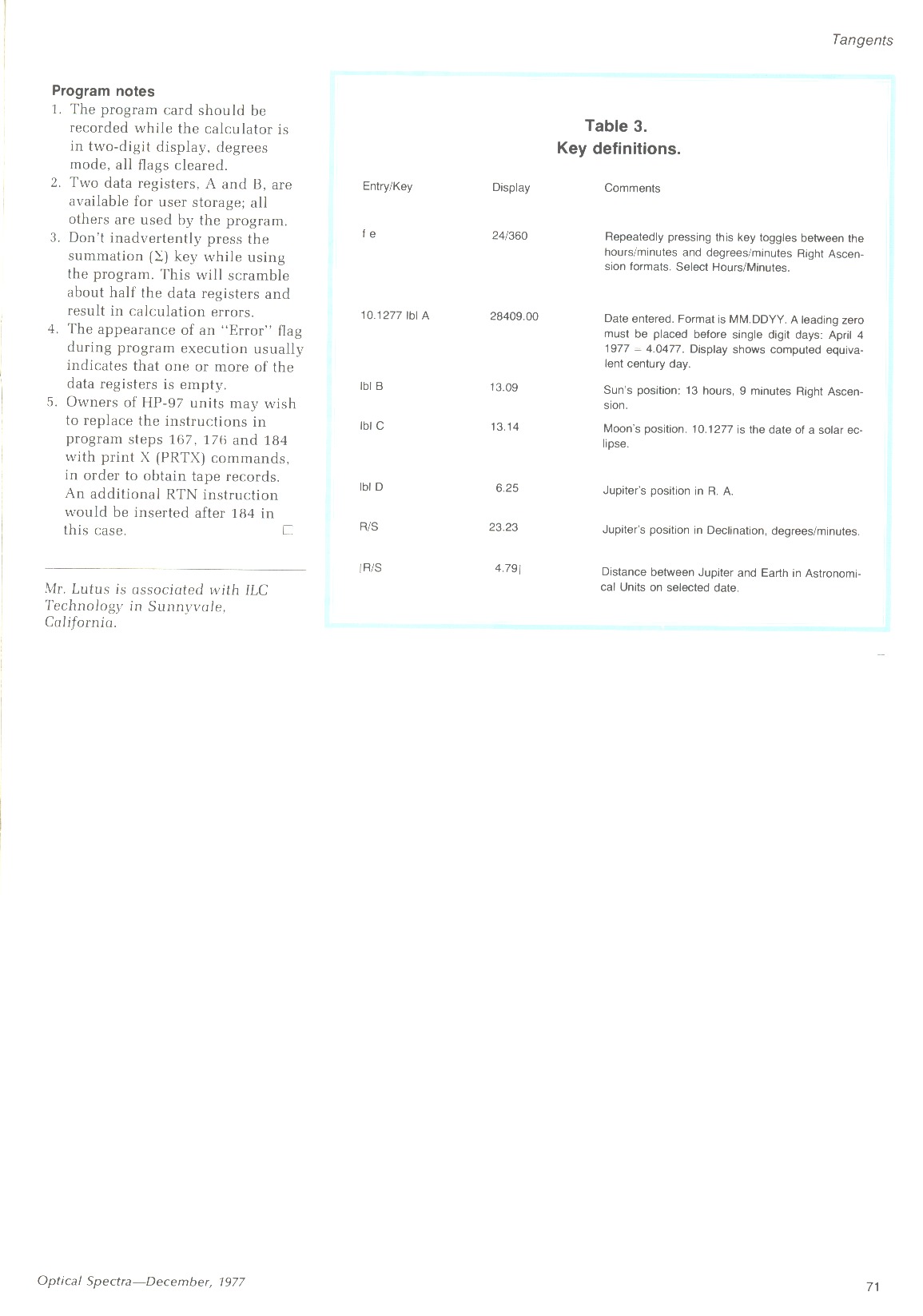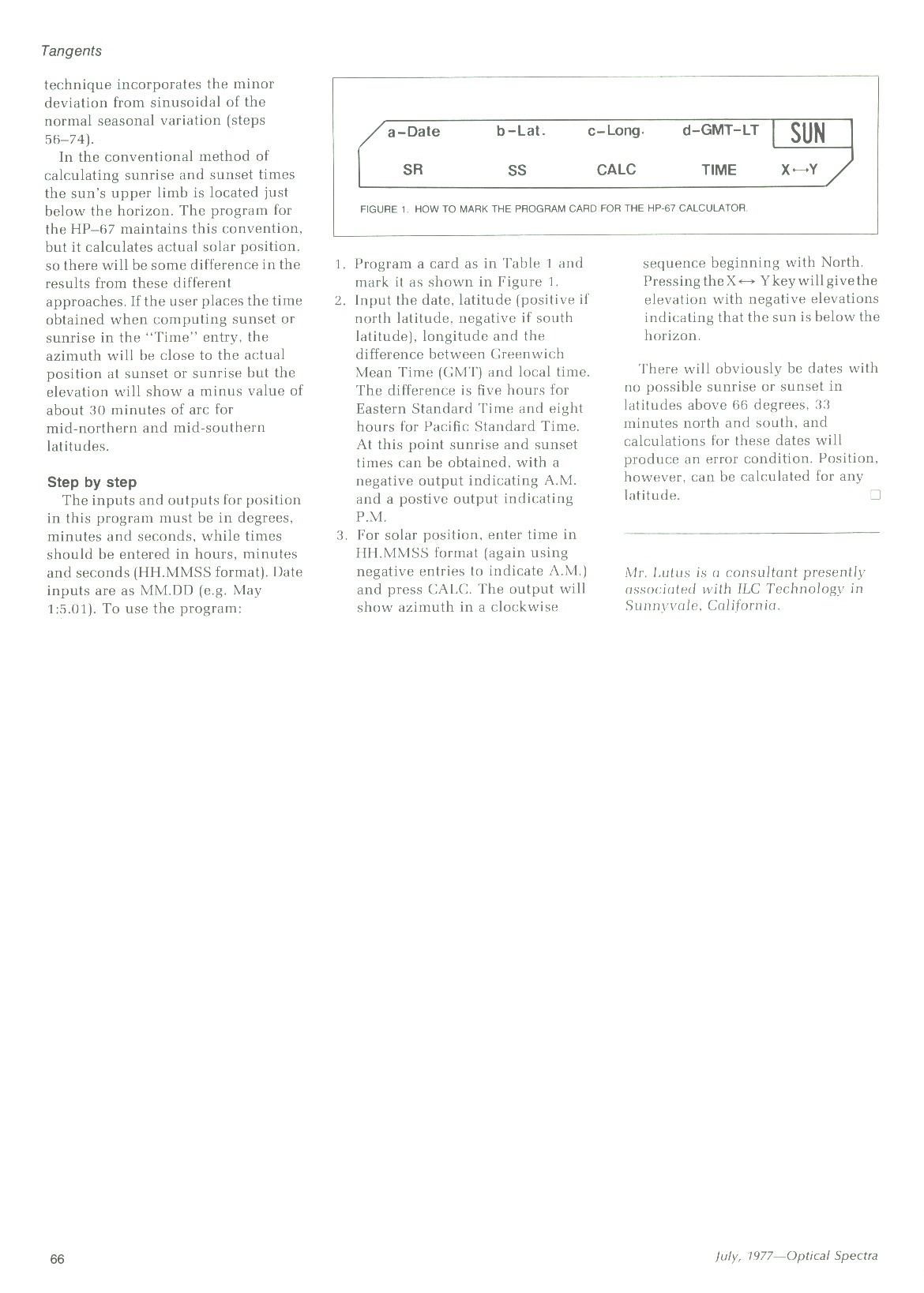This program produced quite a lot of correspondence with those who either wanted to use it in the field with their own HP-67 calculators, or who wanted to convert the algorithm into conventional computer languages for use in mainframe machines. One of the latter was a member of JPL's technical staff, who wanted to rewrite it in FORTRAN for use in a JPL solar energy project (link).
