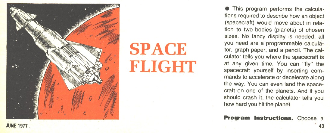 Given these difficulties, and given that programmable calculators had just made their appearance, any calculator programs that performed astronomical or cosmological computations were a matter of great interest in the aerospace field — instead of dealing with the computer department and a 24-hour delay, one could get reasonably accurate results in seconds, using a device that sat on one's desk. In the context of the times, this bordered on the miraculous.