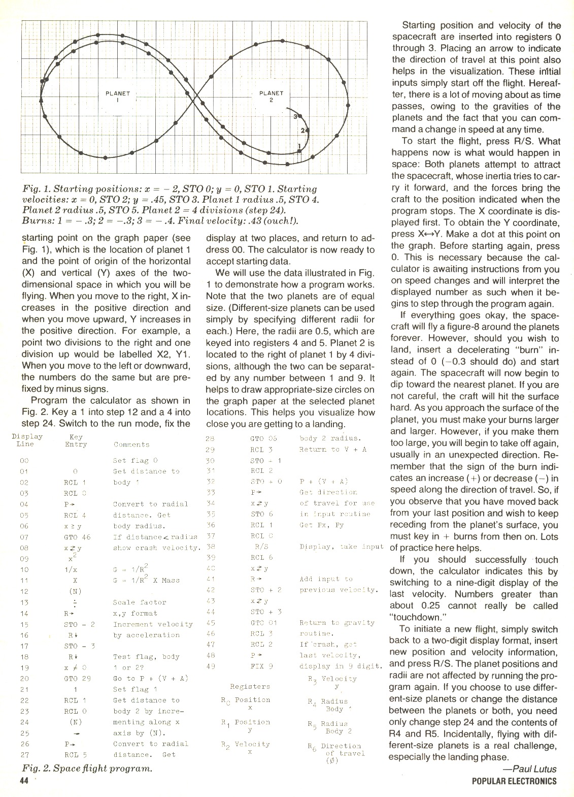 After I played with this program for a while, it occurred to me that other HP-25 owners might want to play with it too, so I wrote an article that I submitted to Popular Electronics magazine, which accepted it. Here are scanned images of the article that resulted: