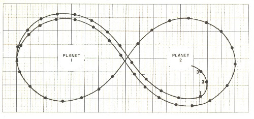 Figure 2: Space Flight program "display"I include this picture so modern readers will realize how much has changed in 40 years. On seeing my article in Popular Electronics, like-minded people had no hesitation about sitting down with a programmable calculator, typing in 50 program steps by hand, then spending hours plotting the position of an imaginary spacecraft on a piece of graph paper. We called it a "computer game".
