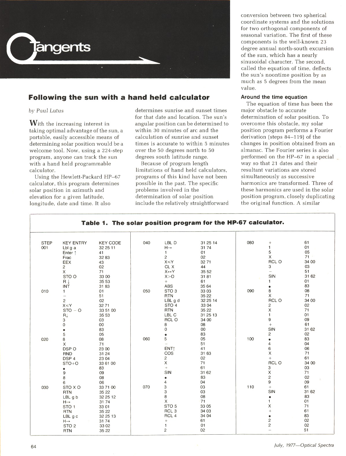 My first published HP-67 program was a solar position / sunrise-sunset calculator, published in the magazine Optical Spectra in 1977: