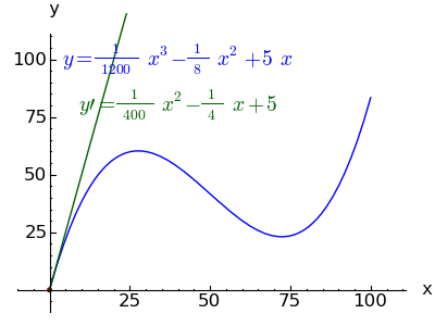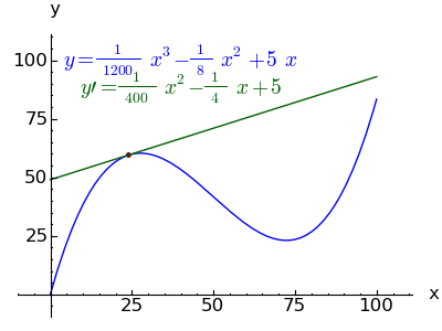 Note: when you paste this cell's content, don't try to "fix" the indentation of certain lines — it's critical to how the cell functions.f(x) = 5*x - x^2/8 + x^3/1200 df(x) = diff(f(x),x) max = 100 p = plot(f(x),x,0,max) lblp = text("$y = " + latex(f(x)) + "$",[40,100],fontsize=14) lbldp = text("$y' = " + latex(df(x)) + "$",[40,80],fontsize=14,rgbcolor='#006000') ga = [] for argx in srange(0,max,5): dp = plot(f(argx) + (df(argx)*(x-argx)),x,0,max,color="#006000") xp = point((argx,f(argx)),rgbcolor='#800000') ga.append(p+lblp+lbldp+dp+xp) animate(ga,ymin=0,ymax=max,axes_labels=['x','y'],fontsize=12,figsize=(4,3)).show(delay=1)Click this image to start or stop the animation: