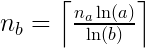 Really brainless. But a while later my blood-sugar levels came back up and I remembered something — the number of digits in a given numerical base b (nb) can be gotten from the number of digits in base a (na) like this: