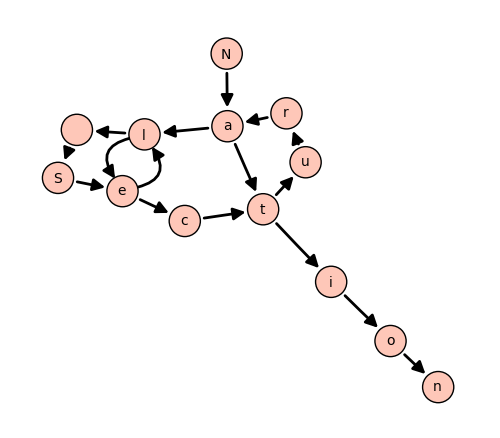 entry='Natural Selection' phrase = list(entry) oc = phrase.pop(0) hash = {} for c in phrase: if(hash.has_key(oc)): hash[oc].append(c) else: hash[oc] = [c] oc = c DiGraph(hash).show(figsize=(5,5))![]()