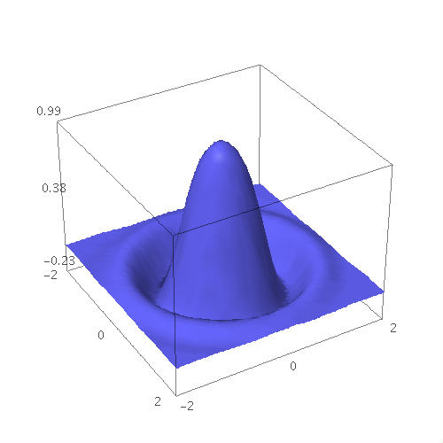 var('x y');plot3d(cos((x^2+y^2)*2) * e^-(x^2+y^2), (x,-2,2), (y,-2,2)).show(aspect_ratio=(1,1,2.5))![]()