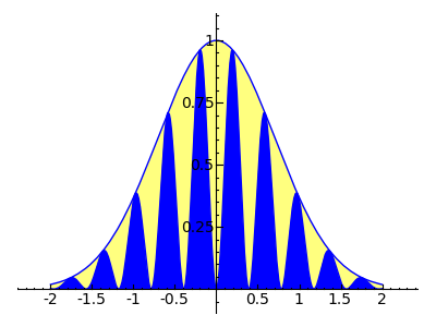 a = plot(sin(x*8)^2 * e^-(x*x),x,-2,2,fill=True,fillcolor='blue',fillalpha=1)b = plot(e^-(x*x),x,-2,2,fill=True,fillcolor='yellow')show(b+a)![]()
