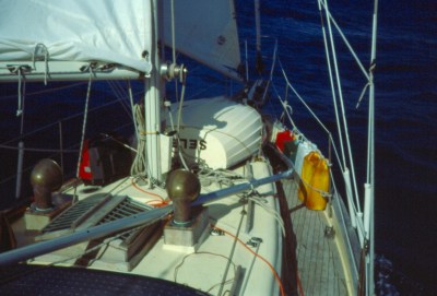 I sail differently at night. I slow down so as not to be thrown around so much, even though it makes the passage longer. In daylight I have more energy to cope with the rough motions of a fast sail. But last night a sudden increase in wind after midnight wiped out my careful planning, so I had to get up, get dressed, and change sails. The wind increase also threw off my power generating plans — it got too strong to use the wind generator. I had watched a movie (I have a tiny TV and some videotapes), thinking I could use the windmill to recharge later. I had to use my high-power deck lights to change sails, so I ended up running down both batteries almost completely by this morning.