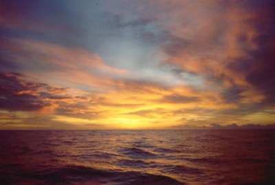 This orange mixture of sunlight and clouds was not part of normal human experience — it didn't pass through panes of tinted glass, or throw shadows across floors. No apple vendors or tax accountants would look up and see it — just this one guy, on a boat. Watching a sunset that only I could see gave me a peculiar sense of responsibility. If I didn't see it and enjoy it, no one would. Only the dolphins and the birds.