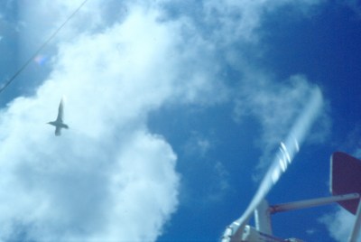 Sometimes I see a long-winged bird that soars just over the waves, hunting for fish. I have some bird books and have eliminated Magnificent Frigatebird and a few others. I still haven't decided what it is. I see fewer as I move away from land, but I see at least one a day. It is brown with a light-colored bill, has long wings with a curve in them, a very efficient glider. Maybe the descriptions in my books are leading me astray — they describe most of the likely ocean birds simply as "black."