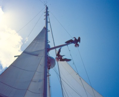 Right now the sailing is nice — a beam wind, smooth seas. The boat is moving briskly, and because the wind is even and the sails full, she is rocking less than when anchored.